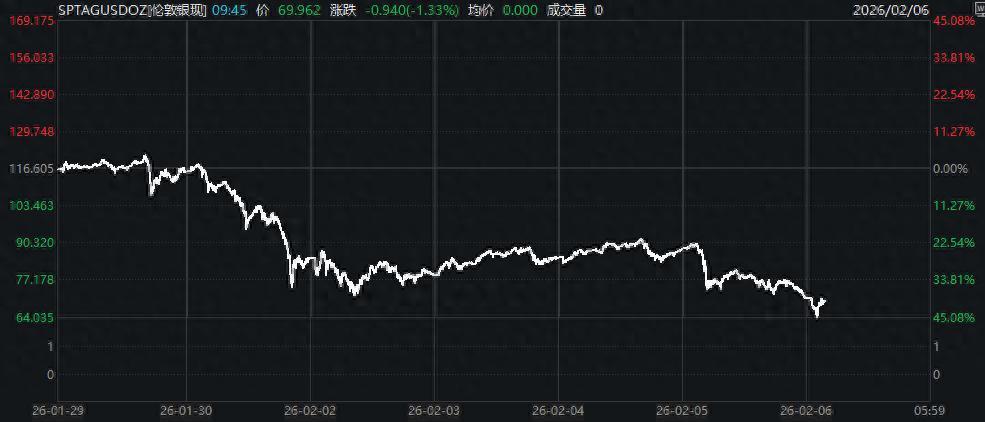 行情数据显示,现货白银在日内亚洲早盘时段一度下探至每盎司64美元,这意味着其较1月29日创下的历史高位121.65美元已近乎腰斩,而这之间仅间隔了相距不到七个交易日。